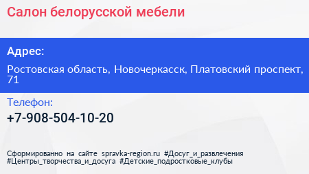 Салон белорусской мебели по адресу Ростовская область, Новочеркасск, Платовский проспект, 71 в дальнейшем Организация, размещена в следующих категориях: