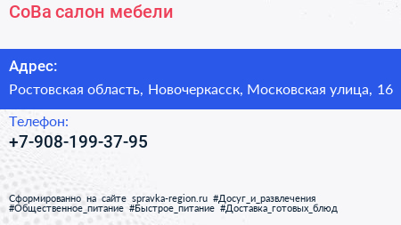 СоВа, салон мебели по адресу Ростовская область, Новочеркасск, Московская улица, 16 в дальнейшем Организация, размещена в следующих категориях: