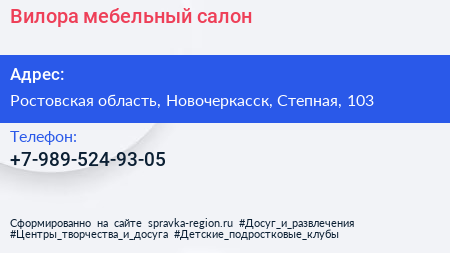 Вилора, мебельный салон по адресу Ростовская область, Новочеркасск, Степная, 103 в дальнейшем Организация, размещена в следующих категориях:
