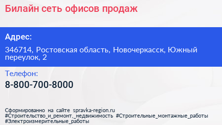 Билайн, сеть офисов продаж по адресу 346714, Ростовская область, Новочеркасск, Южный переулок, 2 в дальнейшем Организация, размещена в следующих категориях: