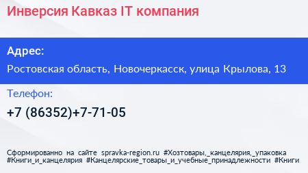 Инверсия-Кавказ, IT-компания по адресу Ростовская область, Новочеркасск, улица Крылова, 13 в дальнейшем Организация, размещена в следующих категориях: