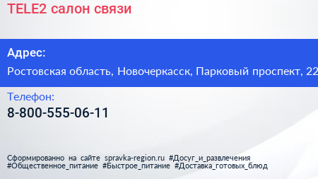 TELE2, салон связи по адресу Ростовская область, Новочеркасск, Парковый проспект, 22 в дальнейшем Организация, размещена в следующих категориях:
