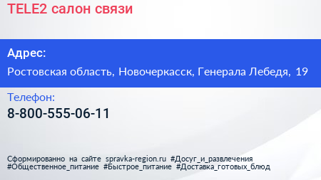 TELE2, салон связи по адресу Ростовская область, Новочеркасск, Генерала Лебедя, 19 в дальнейшем Организация, размещена в следующих категориях: