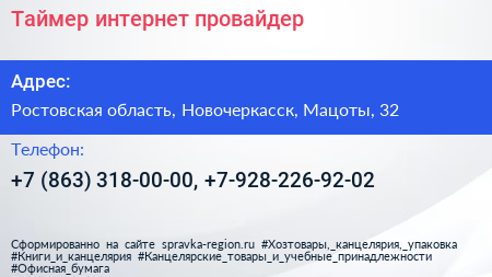 Таймер, интернет-провайдер по адресу Ростовская область, Новочеркасск, Мацоты, 32 в дальнейшем Организация, размещена в следующих категориях: