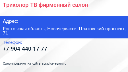 Триколор ТВ, фирменный салон по адресу Ростовская область, Новочеркасск, Платовский проспект, 71 в дальнейшем Организация, размещена в следующих категориях: