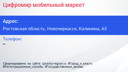 Цифромир, мобильный маркет по адресу Ростовская область, Новочеркасск, Калинина, 63 в дальнейшем Организация, размещена в следующих категориях: