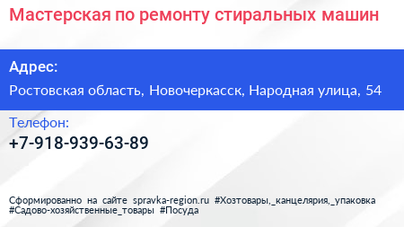 Мастерская по ремонту стиральных машин по адресу Ростовская область, Новочеркасск, Народная улица, 54 в дальнейшем Организация, размещена в следующих категориях: