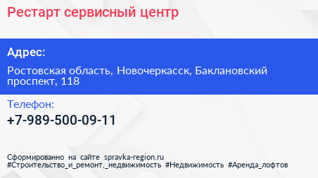 Рестарт, сервисный центр по адресу Ростовская область, Новочеркасск, Баклановский проспект, 118 в дальнейшем Организация, размещена в следующих категориях: