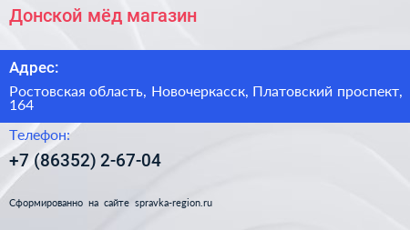 Донской мёд, магазин по адресу Ростовская область, Новочеркасск, Платовский проспект, 164 в дальнейшем Организация, размещена в следующих категориях: