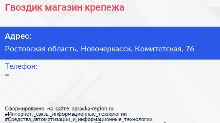 Гвоздик, магазин крепежа по адресу Ростовская область, Новочеркасск, Комитетская, 76 в дальнейшем Организация, размещена в следующих категориях: