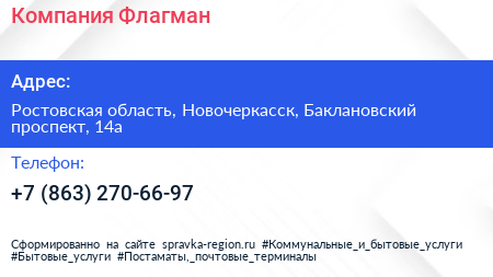 Компания Флагман по адресу Ростовская область, Новочеркасск, Баклановский проспект, 14а в дальнейшем Организация, размещена в следующих категориях: