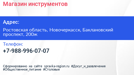 Магазин инструментов по адресу Ростовская область, Новочеркасск, Баклановский проспект, 200ж в дальнейшем Организация, размещена в следующих категориях: