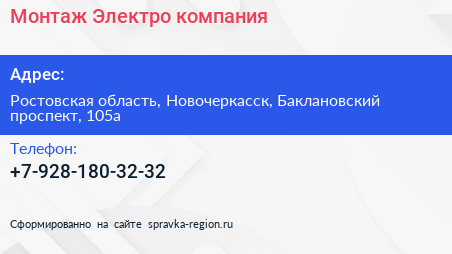 Монтаж-Электро, компания по адресу Ростовская область, Новочеркасск, Баклановский проспект, 105а в дальнейшем Организация, размещена в следующих категориях: