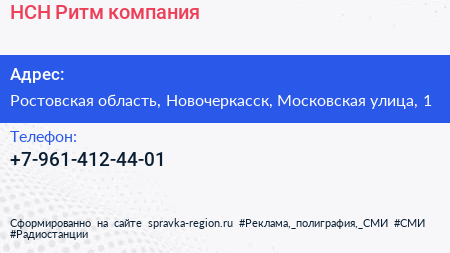 НСН Ритм, компания по адресу Ростовская область, Новочеркасск, Московская улица, 1 в дальнейшем Организация, размещена в следующих категориях: