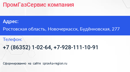 ПромГазСервис, компания по адресу Ростовская область, Новочеркасск, Будённовская, 277 в дальнейшем Организация, размещена в следующих категориях: