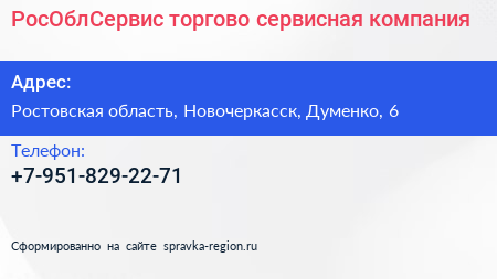 РосОблСервис, торгово-сервисная компания по адресу Ростовская область, Новочеркасск, Думенко, 6 в дальнейшем Организация, размещена в следующих категориях: