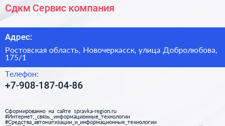 Сдкм Сервис, компания по адресу Ростовская область, Новочеркасск, улица Добролюбова, 175/1 в дальнейшем Организация, размещена в следующих категориях: