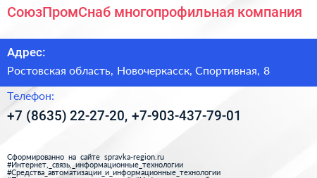 СоюзПромСнаб, многопрофильная компания по адресу Ростовская область, Новочеркасск, Спортивная, 8 в дальнейшем Организация, размещена в следующих категориях: