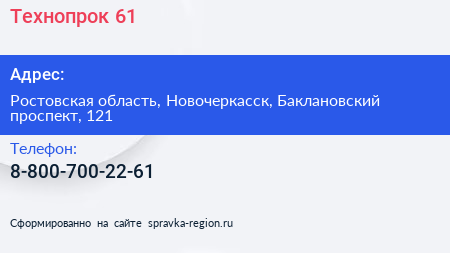 Технопрок-61 по адресу Ростовская область, Новочеркасск, Баклановский проспект, 121 в дальнейшем Организация, размещена в следующих категориях: