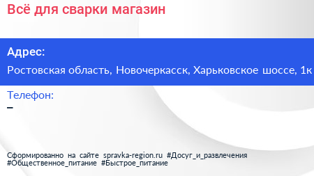 Всё для сварки, магазин по адресу Ростовская область, Новочеркасск, Харьковское шоссе, 1к в дальнейшем Организация, размещена в следующих категориях: