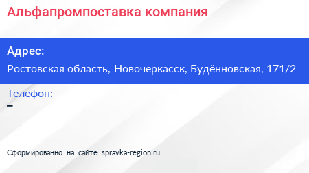 Альфапромпоставка, компания по адресу Ростовская область, Новочеркасск, Будённовская, 171/2 в дальнейшем Организация, размещена в следующих категориях: