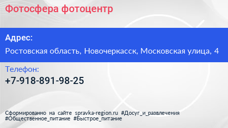 Фотосфера, фотоцентр по адресу Ростовская область, Новочеркасск, Московская улица, 4 в дальнейшем Организация, размещена в следующих категориях: