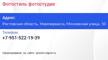 Фотостиль, фотостудия по адресу Ростовская область, Новочеркасск, Московская улица, 50 в дальнейшем Организация, размещена в следующих категориях: