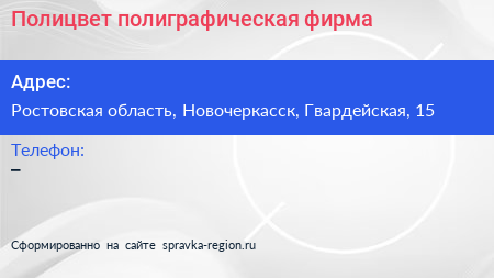 Полицвет, полиграфическая фирма по адресу Ростовская область, Новочеркасск, Гвардейская, 15 в дальнейшем Организация, размещена в следующих категориях:
