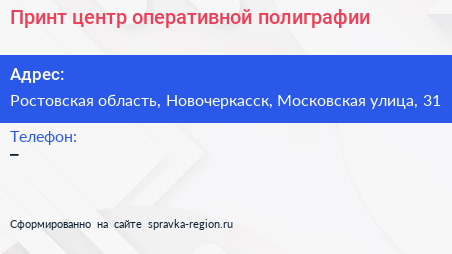 Принт, центр оперативной полиграфии по адресу Ростовская область, Новочеркасск, Московская улица, 31 в дальнейшем Организация, размещена в следующих категориях: