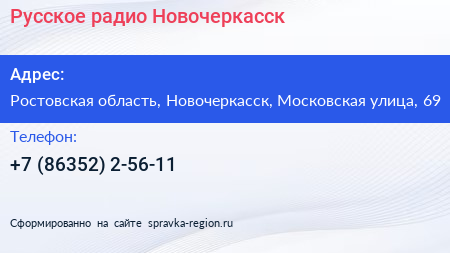 Русское радио-Новочеркасск по адресу Ростовская область, Новочеркасск, Московская улица, 69 в дальнейшем Организация, размещена в следующих категориях: