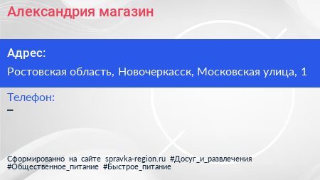 Александрия, магазин по адресу Ростовская область, Новочеркасск, Московская улица, 1 в дальнейшем Организация, размещена в следующих категориях: