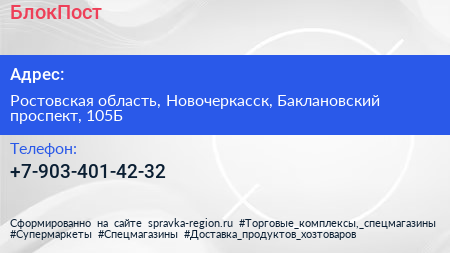 БлокПост по адресу Ростовская область, Новочеркасск, Баклановский проспект, 105Б в дальнейшем Организация, размещена в следующих категориях: