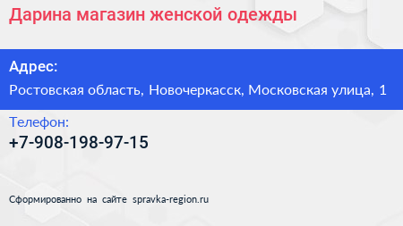 Дарина, магазин женской одежды по адресу Ростовская область, Новочеркасск, Московская улица, 1 в дальнейшем Организация, размещена в следующих категориях: