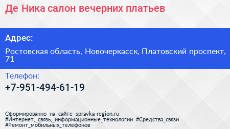 Де Ника, салон вечерних платьев по адресу Ростовская область, Новочеркасск, Платовский проспект, 71 в дальнейшем Организация, размещена в следующих категориях:
