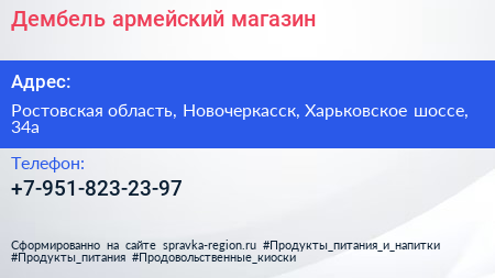 Дембель, армейский магазин по адресу Ростовская область, Новочеркасск, Харьковское шоссе, 34а в дальнейшем Организация, размещена в следующих категориях: