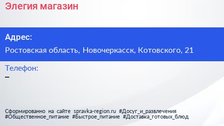 Элегия, магазин по адресу Ростовская область, Новочеркасск, Котовского, 21 в дальнейшем Организация, размещена в следующих категориях: