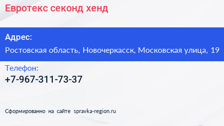 Евротекс, секонд-хенд по адресу Ростовская область, Новочеркасск, Московская улица, 19 в дальнейшем Организация, размещена в следующих категориях: