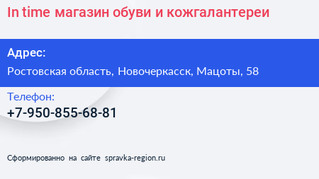 In time, магазин обуви и кожгалантереи по адресу Ростовская область, Новочеркасск, Мацоты, 58 в дальнейшем Организация, размещена в следующих категориях: