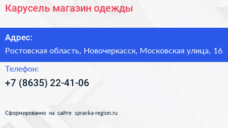 Карусель, магазин одежды по адресу Ростовская область, Новочеркасск, Московская улица, 16 в дальнейшем Организация, размещена в следующих категориях: