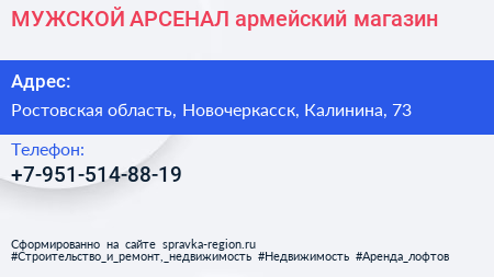 МУЖСКОЙ АРСЕНАЛ, армейский магазин по адресу Ростовская область, Новочеркасск, Калинина, 73 в дальнейшем Организация, размещена в следующих категориях:
