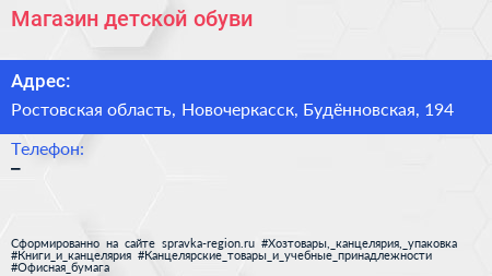 Магазин детской обуви по адресу Ростовская область, Новочеркасск, Будённовская, 194 в дальнейшем Организация, размещена в следующих категориях: