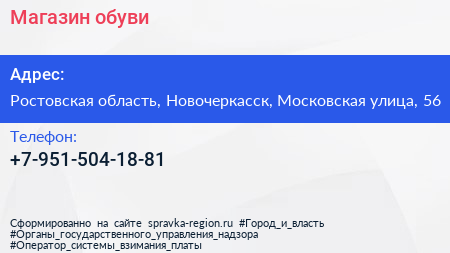 Магазин обуви по адресу Ростовская область, Новочеркасск, Московская улица, 56 в дальнейшем Организация, размещена в следующих категориях: