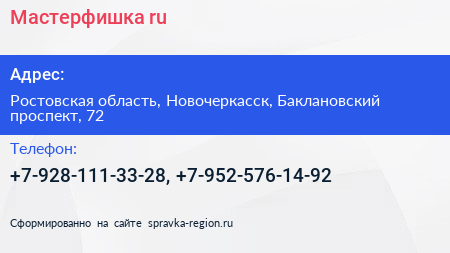 Мастерфишка.ru по адресу Ростовская область, Новочеркасск, Баклановский проспект, 72 в дальнейшем Организация, размещена в следующих категориях: