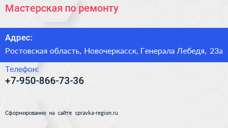 Мастерская по ремонту по адресу Ростовская область, Новочеркасск, Генерала Лебедя, 23а в дальнейшем Организация, размещена в следующих категориях: