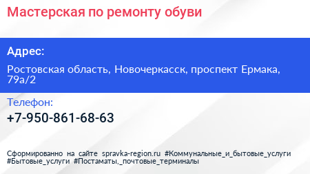 Мастерская по ремонту обуви по адресу Ростовская область, Новочеркасск, проспект Ермака, 79а/2 в дальнейшем Организация, размещена в следующих категориях: