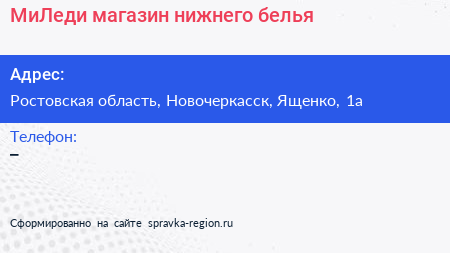 МиЛеди, магазин нижнего белья по адресу Ростовская область, Новочеркасск, Ященко, 1а в дальнейшем Организация, размещена в следующих категориях: