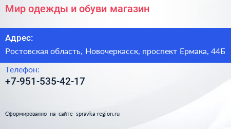 Мир одежды и обуви, магазин по адресу Ростовская область, Новочеркасск, проспект Ермака, 44Б в дальнейшем Организация, размещена в следующих категориях: