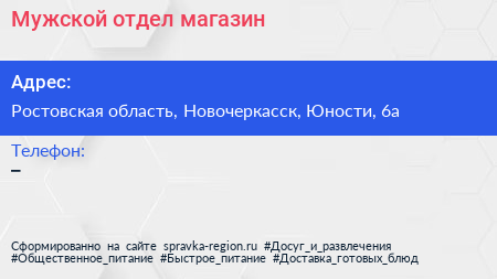 Мужской отдел, магазин по адресу Ростовская область, Новочеркасск, Юности, 6а в дальнейшем Организация, размещена в следующих категориях: