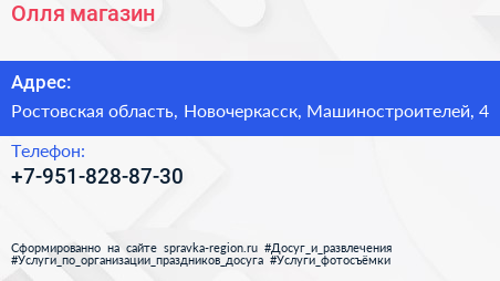 Олля, магазин по адресу Ростовская область, Новочеркасск, Машиностроителей, 4 в дальнейшем Организация, размещена в следующих категориях: