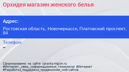 Орхидея, магазин женского белья по адресу Ростовская область, Новочеркасск, Платовский проспект, 84 в дальнейшем Организация, размещена в следующих категориях: